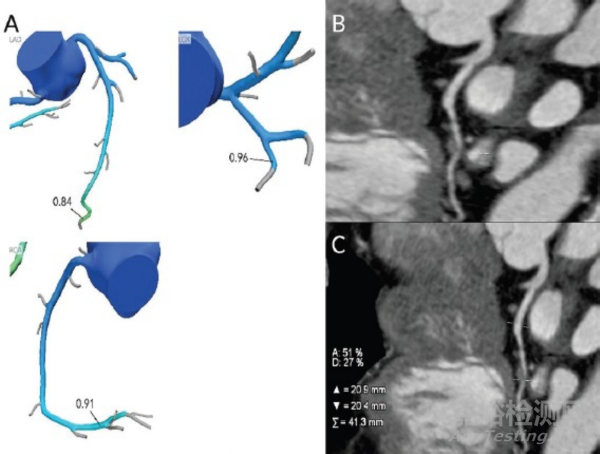 圖5:CT-FFR圖像示例A: LAD, LCx and RCA 的FFR 計(jì)算結(jié)果;B 和 C: 對3維CT數(shù)據(jù)進(jìn)行多平面LAD冠脈提取顯示中等程度狹窄。圖片直接引自文獻(xiàn)[5]