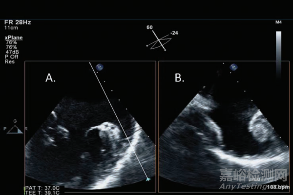 圖8:利用三維經(jīng)食道超聲技術(shù)行左心耳檢查是同時(shí)采集的兩幅正交平面圖像,圖像B與圖像A正交與A中白線所示位置。圖片引自參考文獻(xiàn)[6]