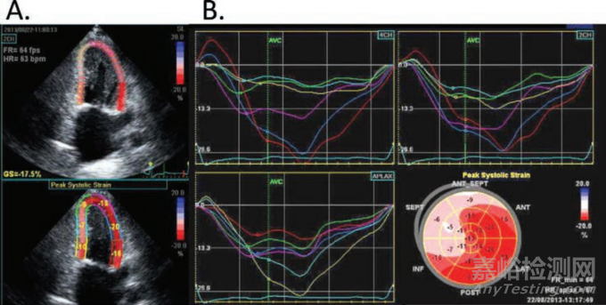 圖9:45歲患高血壓和左心室向心性肥大男性的縱向應(yīng)變成像結(jié)果:圖A 顯示 心尖2室角度圖像 ;圖B顯示心尖4室角度、2室角度和長軸角度局部應(yīng)變曲線,以及展示各節(jié)段峰值收縮應(yīng)變的牛眼圖(靶心圖)。圖中所示,此患者EF值正常,但心肌多個(gè)節(jié)段的峰值收縮應(yīng)變幾乎消失。圖片引自參考文獻(xiàn)[6]