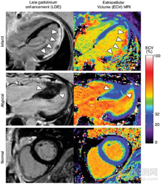 圖13:LGE延遲強(qiáng)化顯像與T1 Map ECV顯像的三個(gè)對比示例。圖片引自參考文獻(xiàn)[11]