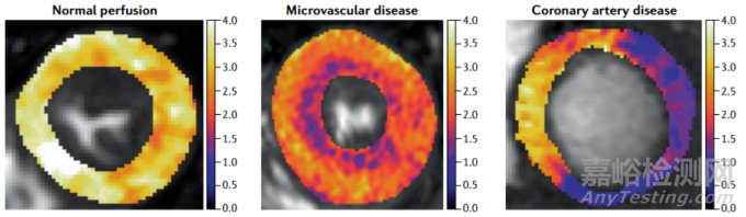 圖14:(a) 針對MRI心肌灌注顯像的分型分析鑒別心外膜和心內(nèi)膜缺血;(b) 動態(tài)血流定量高分辨率CMR灌注顯像鑒別正常灌注、微循環(huán)病變和冠脈病變.。圖片引自參考文獻(xiàn)[6]
