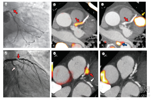 前側(cè) NSTEMI 患者:(d) 冠脈造影顯示近端LAD和 LCx狹窄,其中LAD為主要問題病灶 (e) 18F-NaF PET-CT影像顯示LAD病灶高攝取 , LCx病灶無攝??;(f) 18F-FDG PET-CT 影像顯示兩病灶均無攝取。圖片引自參考文獻(xiàn)[12]