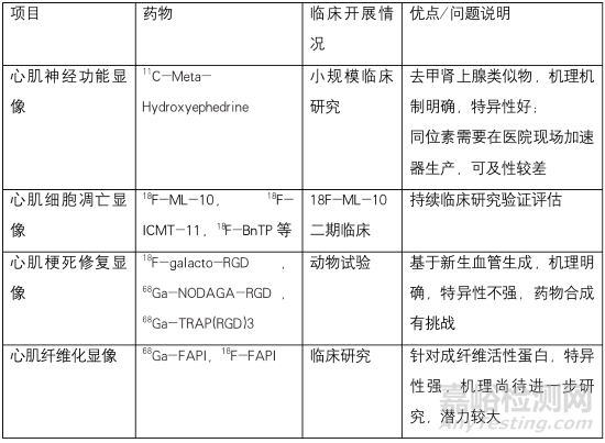 項(xiàng)目藥物臨床開展情況優(yōu)點(diǎn)/問題說明心肌代謝顯像123I-BMIPP較大規(guī)模臨床研究反映支鏈脂肪酸代謝,具備“缺血記憶”功能,可用于合并腎功能疾病和不適于負(fù)荷顯像的患者的缺血診斷心肌神經(jīng)功能顯像123I-MIBG常規(guī)臨床應(yīng)用去甲腎上腺類似物,機(jī)理機(jī)制明確,特異性好;已取得FDA注冊證,部分具備條件的醫(yī)院已開展臨床常規(guī)應(yīng)用,但同位素需要加速器生產(chǎn),可及性有一定局限心肌細(xì)胞凋亡顯像99mTc-annexin-VIIa臨床研究最早,最具代表性的心肌細(xì)胞凋亡顯像藥物,用于粥樣硬化直接顯像,缺血和再灌注傷害以及心肌炎等評估心肌梗死修復(fù)顯像99mTc-galacto-RGD,99mTc-3P-RGD2臨床研究基于新生血管生成,機(jī)理明確,特異性不強(qiáng),藥物合成簡便,性價(jià)比高心肌纖維化顯像99mTc-HFAPI臨床研究針對成纖維活性蛋白,特異性強(qiáng),機(jī)理尚待進(jìn)一步研究,潛力較大。