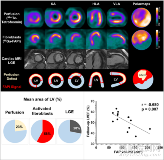 圖17:急性前壁心肌梗死的典型病例:使用SPECT心肌灌注顯像(第一行)、68Ga-FAPI-46 PET心肌纖維化顯像(第二行)、心臟磁共振晚期釓增強(qiáng)(LGE)(第三行),并聯(lián)合灌注區(qū)域的FAP高攝取區(qū)域進(jìn)行分析(第四行)。成纖維細(xì)胞激活面積超過梗死缺血面積和LGE信號,是最常見的心肌FAP-分布類型.左下角:35例患者的平均灌注缺損面積、FAPI信號和LGE。右下角:急性心肌梗死后早期整體心肌FAP容積與慢性期隨訪時(shí)左室射血分?jǐn)?shù)(LVEF)呈負(fù)相關(guān)(n=14)。圖片引自SNMMI-2022官方網(wǎng)站。