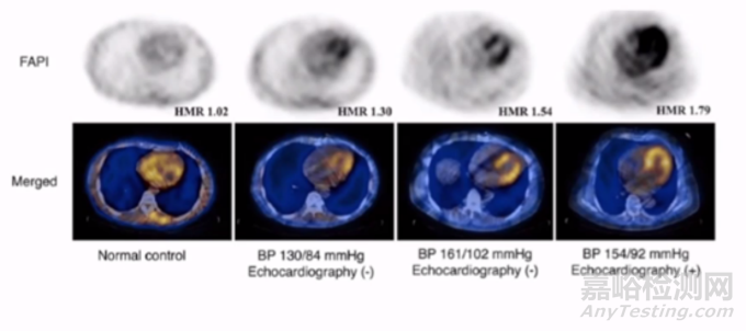 與前文所述的正電子核素標(biāo)記FAPI藥物相比,99mTc-HFAPI采用相近的配體結(jié)構(gòu),針對相同的靶點(diǎn),在靶向性和親和力方面也具有較好的可比性,因此從原理上,PET FAP顯像的心肌纖維化評估功能完全可以通過99mTc-HFAPI SPECT顯像來實(shí)現(xiàn)。相關(guān)基礎(chǔ)研究表明,心肌纖維化與多種心血管病理因素具有相關(guān)性[17],如下圖19所示。首都醫(yī)科大學(xué)附屬北京朝陽醫(yī)院楊敏福教授一項(xiàng)尚未發(fā)表的研究結(jié)果表明,SPECT 顯像揭示患者心肌FAP表達(dá)情況與血壓具有較高的相關(guān)性,如圖20所示。