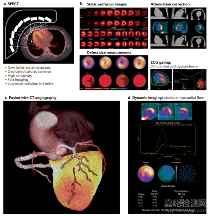 圖21:a、新型基于半導(dǎo)體探測器聚焦心臟成像的心臟專用SPECT原理示意;b、a中所示設(shè)備的代表性心肌灌注圖像;c、SPECT心肌灌注圖像與CT冠脈造影圖像融合與三維顯示,展示冠脈狹窄與心肌缺血的對應(yīng)關(guān)系;D、基于a設(shè)備的心肌血流絕對定量動態(tài)顯像。圖片引自參考文獻(xiàn)[6]