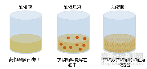 報道中用于給藥的油凝膠,大多是通過皮下注射形成LAI藥物儲庫,該類制劑通常由載體油、凝膠劑、共溶劑和API組成。膠凝劑在油相和共溶劑相中的溶解度對膠凝質(zhì)量有顯著影響。當共溶劑從油基質(zhì)中擴散出后,凝膠劑在載體油中的溶解度下降繼而在油中快速結(jié)晶或沉淀,油和凝膠劑之間的弱相互作用形成了均勻分散的網(wǎng)絡(luò)結(jié)構(gòu),這種網(wǎng)絡(luò)結(jié)構(gòu)減緩了藥物從油相向體液中的擴散。圖1從結(jié)構(gòu)上描述了油凝膠與油溶液、油混懸液的區(qū)別。