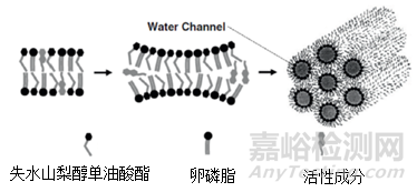 流體晶成型材料大多是脂類輔料,一般通過水合或溶劑化形成一系列熱力學穩(wěn)定的流體晶,常用的材料有油酸甘油酯(GMO)、雙油酸甘油酯(GDO)、甘油酸油酯(OG)、植物三醇(PT)和山梨醇單油酸酯(SMO)。其中GMO是研究最多的流體晶成型材料,不僅因為其在水溶液中的高溶脹力,還因為其優(yōu)良的乳化性和生物降解性。