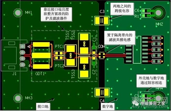 (2)共模電感和跨接電容應(yīng)放置在隔離帶中。