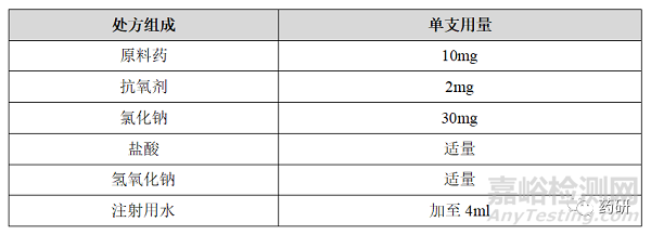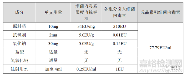 如假設(shè)某注射劑產(chǎn)品規(guī)格為4ml:10mg,制定的產(chǎn)品細(xì)菌內(nèi)毒素是80EU/ml,其單支處方組成如下: