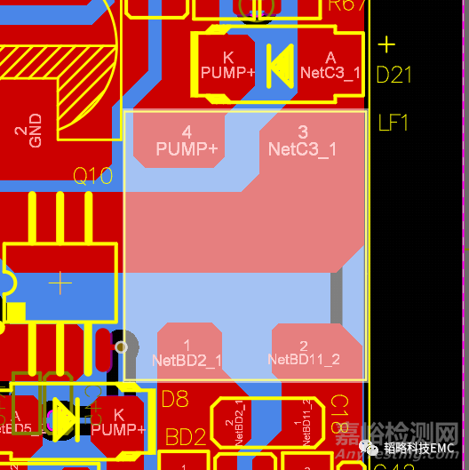 從測試數(shù)據(jù)中可以看出,在去掉板上的共模電感后,數(shù)據(jù)反而好了很多,某些頻點(diǎn)甚至下降了十幾個(gè)db,加了共模電感反而更差這是為什么呢?這是共模電感l(wèi)ayout不合理導(dǎo)致的,共模電感的正確layout如下: