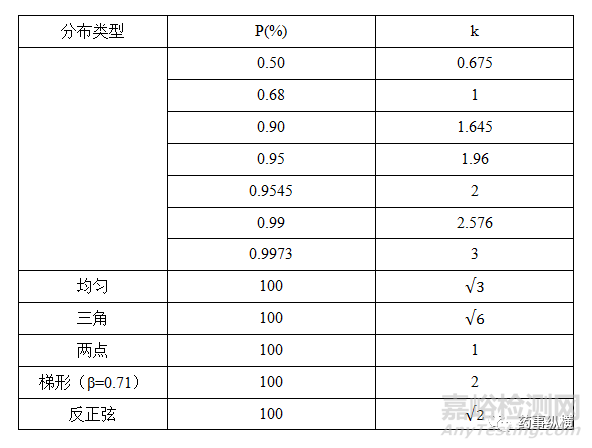 式中:a為被測量可能值區(qū)間的半寬度。當k為擴展不確定度的倍乘因子時(擴展不確定度是標準差的倍數(shù))稱包含因子(如果xi來源于說明書、校準證書、手冊或其他資料),其他情況下根據(jù)概率論獲得的k稱置信因子。B類評定常用到正態(tài)分布、均勻分布和三角分布。對應k值見下表: