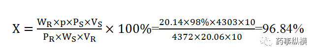 式中X為某原料藥的百分含量;WR為對照品稱樣量;PR為對照品溶液中主成分的峰面積;PS為樣品中主成分的峰面積;WS為樣品稱樣量;VS為樣品稀釋倍數(shù);VR為對照品稀釋倍數(shù);p為對照品的純度(標識量,無需考慮不確定度);