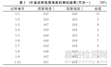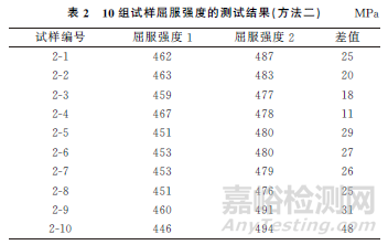 從表1,2可以看出:方法一測(cè)試同組試樣屈服強(qiáng)度的最大差值為11MPa,最小差值為1MPa,平均差值為5MPa,且10組結(jié)果差值較為接近;方法二測(cè)試同組試樣屈服強(qiáng)度的最大差值為48MPa,最小差值為11MPa,平均差值為26MPa,10組結(jié)果差值差異較大。因此,采用方法一取樣進(jìn)行力-位移法拉伸試驗(yàn)和配置引伸計(jì)拉伸試驗(yàn)。