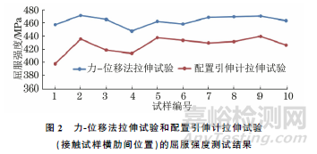分別采用力-位移法拉伸試驗(yàn)和配置引伸計(jì)拉伸試驗(yàn)對(duì)試樣進(jìn)行屈服強(qiáng)度測(cè)試,其中引伸計(jì)上下刀口中點(diǎn)接觸試樣的橫肋間位置,結(jié)果如圖2所示。