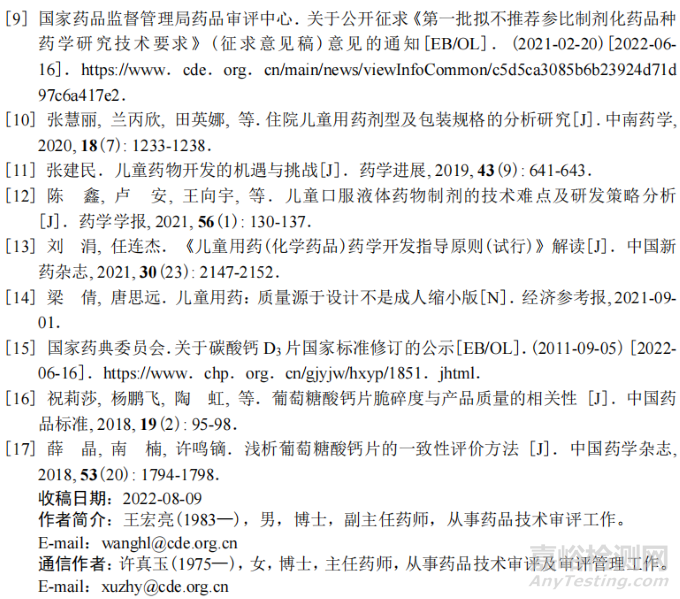 在兒童鈣補(bǔ)充劑開(kāi)發(fā)早期應(yīng)綜合考慮藥物劑型與原料藥關(guān)鍵理化特性(如生物藥劑學(xué)分類(lèi)系統(tǒng)分類(lèi))等,選擇適合的原料藥形式(游離酸/堿、鹽、晶型、溶劑化物等),以提高藥物的可接受性。同一種原料藥可開(kāi)發(fā)不同的給藥途徑和(或)劑型,以滿(mǎn)足不同健康狀況、疾病發(fā)展情況或行為特點(diǎn)的各年齡段兒童的治療需求。例如,口服溶液劑的原料藥應(yīng)選擇具有溶解性更高的鹽型;而口服混懸劑則可選擇溶解性較差的游離堿形式,以改善藥物的口味等[8]。兒童鈣補(bǔ)充劑中使用的原料藥如葡萄糖酸鈣、碳酸鈣、維生素 D3 等的內(nèi)控標(biāo)準(zhǔn)應(yīng)不低于國(guó)內(nèi)外藥典標(biāo)準(zhǔn)??赏ㄟ^(guò)顏色反應(yīng)、特征反應(yīng)、薄層色譜法和紅外吸收光譜比對(duì)等方法鑒別原料藥,檢查干燥失重、溶液澄清度、酸堿度、氯化物、氫化物、蔗糖或還原糖類(lèi)、酸中不溶物、硫酸鹽、草酸鹽、鋇鹽、鐵鹽、鎂鹽與堿金屬鹽、鎘、汞、重金屬、砷鹽等質(zhì)量指標(biāo),還要進(jìn)行含量測(cè)定,要求原料藥含量應(yīng)不低于藥典標(biāo)準(zhǔn)。此外,須結(jié)合結(jié)構(gòu)、處方、制備工藝路線(xiàn)及國(guó)外藥典標(biāo)準(zhǔn)完善對(duì)雜質(zhì)(包括有機(jī)雜質(zhì)、潛在致突變雜質(zhì)、殘留溶劑等)和粒度的研究和控制,對(duì)原料藥制定合理的內(nèi)控標(biāo)準(zhǔn)。