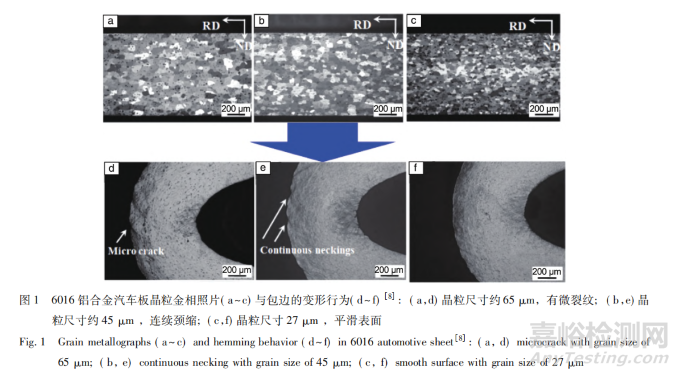 Hirth 等研究表明,6016 合金板材中 Si 含量過(guò)高會(huì)增加裂紋起源點(diǎn),導(dǎo)致包邊性能下降。Li 等研究指出,6014 合金板材的包邊性能隨著 Mg 與 Si 含量的提高而減低,并通過(guò)板材拉伸斷裂應(yīng)變的變化給出了合理的解釋。Zhang 等研究了 6016 板材包邊性能與晶粒尺寸的關(guān)系,隨著晶粒細(xì)化,促進(jìn)微裂紋擴(kuò)展的剪切帶變?nèi)?,板材包邊性能顯著提升,如圖 1 所示。Ikawa 等研究了板材包邊性能與織構(gòu)的關(guān)系,發(fā)現(xiàn) Taylor 因子較高的立方織構(gòu)、ND45-立方織構(gòu)利于提升包邊性能。