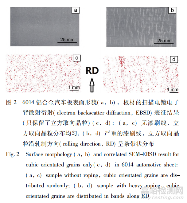 漆刷線是指鋁合金汽車板經(jīng)沖壓、涂裝后沿軋制方向呈現(xiàn)的條紋。如果程度嚴(yán)重,將影響汽車美觀,需要嚴(yán)格控制在二級(jí)以上。大多數(shù)學(xué)者認(rèn)為,漆刷線是由于立方取向晶粒沿軋制方向連續(xù)分布所致( 圖 2) 。