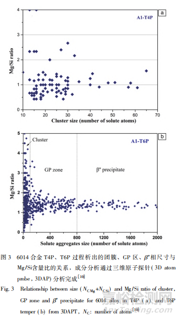 6XXX 系鋁合金汽車板烤漆后的強(qiáng)度取決于 β″析出相的大小與密度,可以通過(guò)合金成分及熱處理工藝來(lái)調(diào)控。室溫停放過(guò)程中,6XXX 系鋁合金容易發(fā)生自然時(shí)效,形成富 Si 的團(tuán)簇,烤漆時(shí)不利于 β″相的析出,烘烤強(qiáng)度較低。對(duì)其預(yù)時(shí)效可以獲得 30 個(gè)原子以上的較大團(tuán)簇,其 Mg 和 Si 含量比接近 1( 圖 3a) ,與烤漆 T6P 過(guò)程析出的 β″相成分相近( 圖 3b) 。因此,這些團(tuán)簇可以作為烤漆過(guò)程 β″相的核促進(jìn)析出,有利于增加 β″相的密度,提高烤漆后的強(qiáng)度。