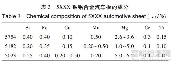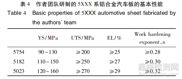 5XXX 系鋁合金是一種不可熱處理強(qiáng)化鋁合金,Mg為主要合金元素,起固溶強(qiáng)化作用。相比 6XXX 系鋁合金,其成形性能更好,因而成為汽車內(nèi)覆蓋件、結(jié)構(gòu)件的首選材料。表 3 為美國(guó)鋁業(yè)協(xié)會(huì)標(biāo)準(zhǔn)指定的 3 種 5XXX系鋁合金的成分范圍,常用的 5XXX 系鋁合金汽車板牌號(hào)為 5754、5182,5023 合金含 0. 20% ~ 0. 50%的 Cu,是為提高烤漆強(qiáng)度開(kāi)發(fā)的新合金。表 4 為中鋁材料應(yīng)用研究院所開(kāi)發(fā)的 5XXX 系汽車板的基本性能。