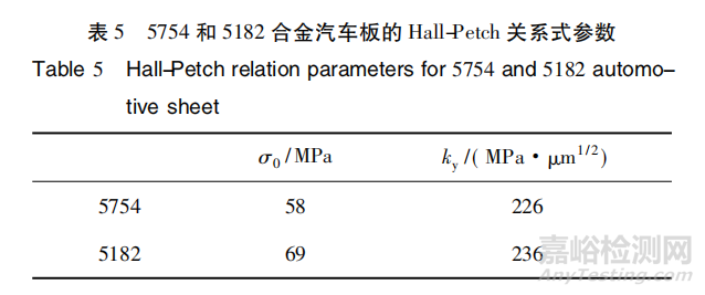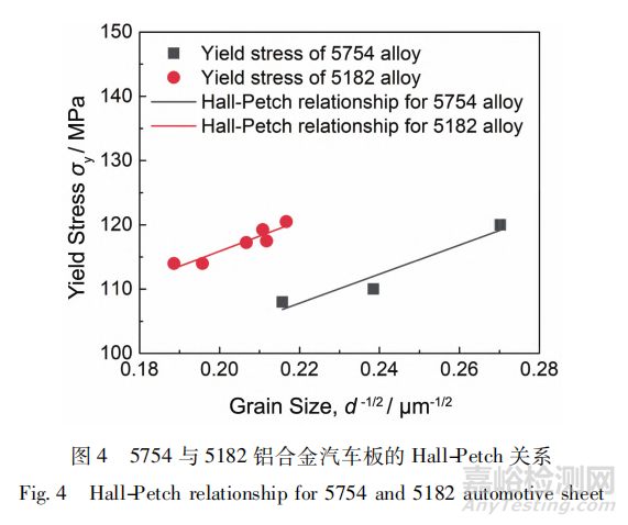 5XXX 系鋁合金汽車板的屈服強(qiáng)度是影響其成形回彈的重要指標(biāo),可以通過(guò) Mg 的固溶量及晶粒尺寸進(jìn)行調(diào)控。5754、5182 鋁合金汽車板的屈服強(qiáng)度與晶粒尺寸之間的關(guān)系如圖 4 所示,服從 Hall-Petch 關(guān)系:σy =σ0+kyd-1/2,其中: σy為屈服強(qiáng)度,σ0是摩擦應(yīng)力,d 為晶粒尺寸,ky為晶界阻力常數(shù)。對(duì) 5754、5182 鋁合金汽車板的退火溫度分別為 360,500 ℃,其 σ0與 ky數(shù)值如表5 所示。隨著 Mg 含量提高,摩擦阻力、晶界阻力增大,表明固溶的 Mg 原子對(duì)位錯(cuò)運(yùn)動(dòng)的阻力更大,激活相鄰晶粒位錯(cuò)源開(kāi)動(dòng)所需的應(yīng)力更高。
