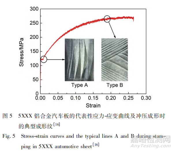 5XXX 系鋁合金汽車板在沖壓成形過(guò)程中,表面易出現(xiàn)成形紋,需嚴(yán)格控制。圖 5 為 5XXX 鋁合金汽車板的代表性應(yīng)力-應(yīng)變曲線及沖壓成形時(shí)的典型成形紋。成形紋路分為 A 型和 B 型兩種。A 型即呂德斯帶,在沖壓板材的表面表現(xiàn)為火焰狀花紋,在應(yīng)力-應(yīng)變曲線上表現(xiàn)為屈服應(yīng)變平臺(tái),可以用屈服點(diǎn)伸長(zhǎng)率( yield point elongation,YPE) 來(lái)表征,是位錯(cuò)被 Mg 原子Cottrell 氣團(tuán)釘扎所引起。B 型在沖壓板材的表面表現(xiàn)為平行的直線狀花紋,對(duì)應(yīng)于應(yīng)力-應(yīng)變曲線的鋸齒狀部分,起源于塑性變形過(guò)程中 Mg 原子動(dòng)態(tài)應(yīng)變時(shí)效,即 PLC( Portevin-Le Chatelier) 效應(yīng)。