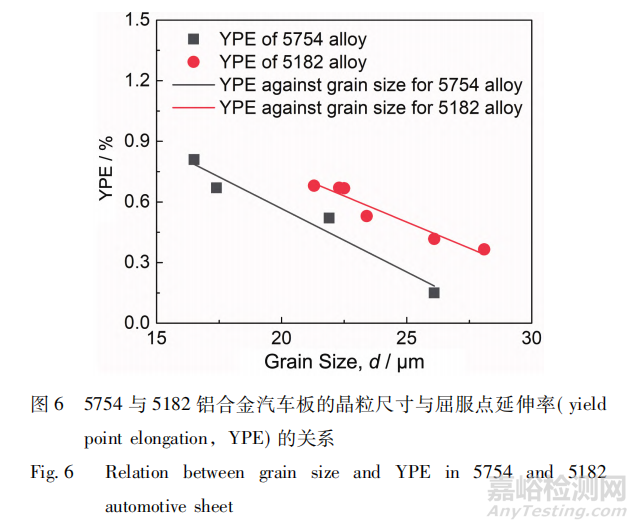 圖 6 為 5754 與 5182 鋁合金汽車板 YPE 與晶粒尺寸的關(guān)系。隨著晶粒尺寸增大,YPE 減低,有助于削弱呂德斯帶。與 5754 合金相比,5182 合金的 YPE 較高,更加容易產(chǎn)生呂德斯帶,這是由于后者退火后產(chǎn)生更多的Mg 原子 Cottrell 氣團(tuán)。工業(yè)上可以通過(guò)增大晶粒尺寸,提高退火后的冷卻速率及施加應(yīng)變來(lái)消除呂德斯帶。