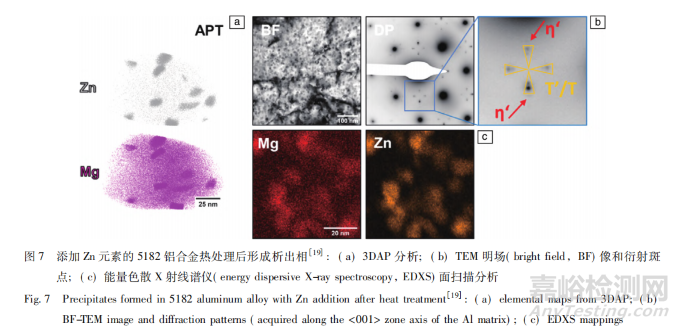 為了進(jìn)一步提升輕量化效果,可以在 5XXX 系鋁合金中添加 Cu 或 Zn 元素,通過(guò)烤漆實(shí)現(xiàn)析出強(qiáng)化。圖 7 表明含 Zn 的 5182 鋁合金在烤漆過(guò)程中析出了 Mg 和Zn 富集的 η'相,提高了材料強(qiáng)度。