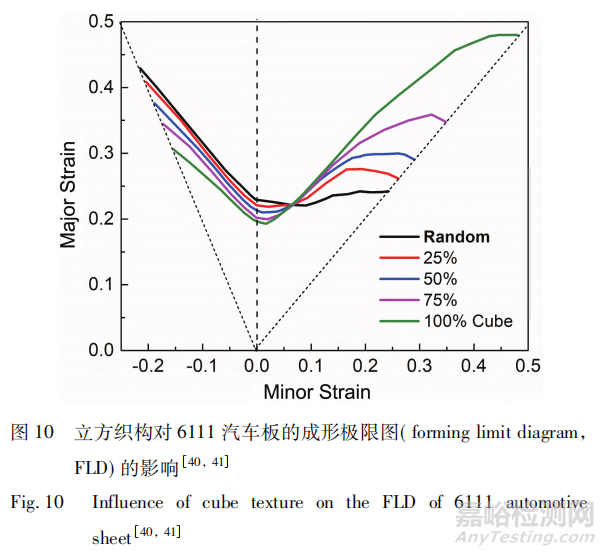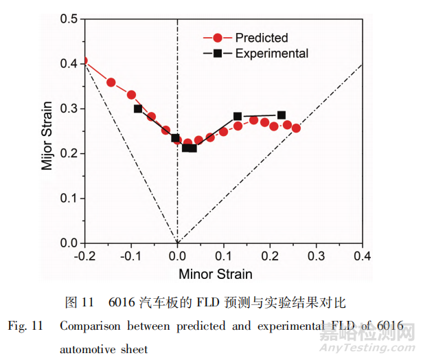 Wu 等通過(guò)晶體塑性理論結(jié)合 M-K 模型計(jì)算了 6111-T4 板材的 FLD,并研究了織構(gòu)對(duì)成形極限的影響,如圖 10 所示。作者采用該方法預(yù)測(cè)了 6016-T4P 汽車板材的成形極限,如圖 11 所示,計(jì)算結(jié)果與實(shí)驗(yàn)結(jié)果吻合度高。