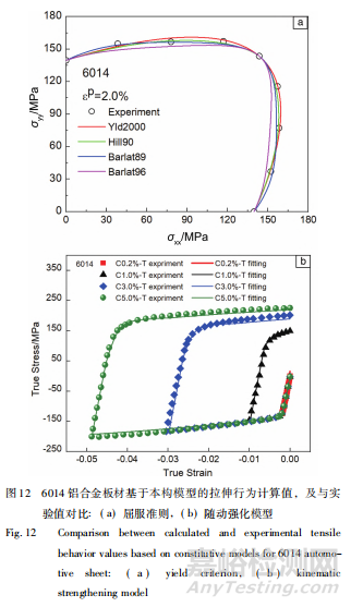 屈服準(zhǔn)則是本構(gòu)模型的重要內(nèi)容之一,作者團(tuán)隊(duì)通過(guò)雙向拉伸實(shí)驗(yàn)對(duì) 6014 鋁合金汽車板的屈服準(zhǔn)則進(jìn)行了研究,結(jié)果如圖 12a 所示,表明 Barlat89、Yld2000-2d 屈服準(zhǔn)則具有較高的精度,理論計(jì)算值與實(shí)驗(yàn)值吻合較好。精確的強(qiáng)化模型是另外一個(gè)重要內(nèi)容,作者通過(guò)拉-壓實(shí)驗(yàn)研究了反向加載條件下 6014 鋁合金汽車板的強(qiáng)化規(guī)律,建立了 Y-U 隨動(dòng)強(qiáng)化模型,如圖 12b 所示,與實(shí)驗(yàn)結(jié)果基本一致。