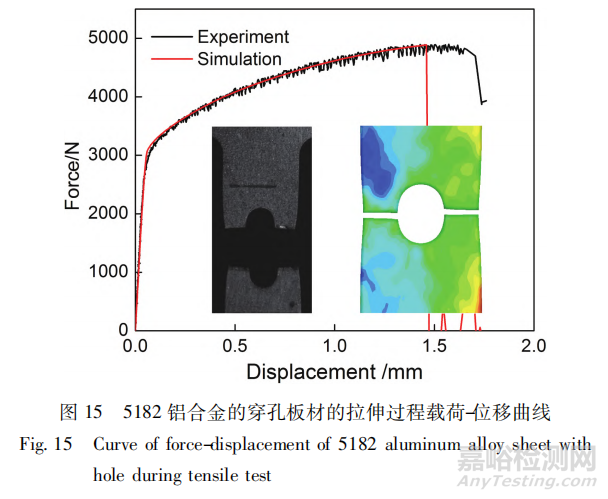 作者團(tuán)隊(duì)系統(tǒng)研究了汽車發(fā)動(dòng)機(jī)罩內(nèi)板 5182 合金板與結(jié)構(gòu)件 5754 合金板的 SPR 連接過(guò)程和板材的力學(xué)性能對(duì)接頭性能的影響。對(duì)穿孔試樣拉伸過(guò)程模擬與拉伸實(shí)驗(yàn)載荷-位移曲線進(jìn)行對(duì)標(biāo),確定材料斷裂的極限應(yīng)變,如圖 15 所示。建立 SPR 接頭變形模型,采用 DEFORM 軟件獲得了模擬接頭的橫斷面,如圖 16 所示,與實(shí)際鉚接接頭斷面形貌基本一致,接頭互鎖值、底厚值等關(guān)鍵參數(shù)的計(jì)算值與實(shí)驗(yàn)值的誤差在 5%以內(nèi),模型精度較高。通過(guò)數(shù)值模擬方法已優(yōu)化出多種汽車零部件的 SPR工藝。