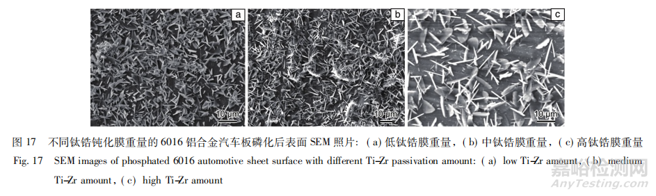 磷化的原理是磷酸鋅鹽在鋁合金表面沉積。鋁合金自身容易氧化,通常在溶液中加入一定的氟離子去除表面氧化膜,并且將多余的鋁離子以沉淀的形式析出,防止磷酸鋁鹽生成,影響磷化膜在表面的生長(zhǎng)。鋁合金汽車板在出廠前一般要進(jìn)行清洗、鈍化處理,去除表面較厚的氧化膜,并形成薄而致密的鈦鋯鈍化膜,這層鈍化膜會(huì)對(duì)基材的磷化處理產(chǎn)生一定影響。作者團(tuán)隊(duì)研究了鈦鋯鈍化膜重量對(duì) 6016 鋁合金汽車板磷化的影響( 圖 17) ,當(dāng)鋁合金表面鈦鋯鈍化膜處于較低或中等重量水平時(shí),磷化結(jié)晶體尺寸適中,并且能夠?qū)⒈砻嫒采w;當(dāng)鈦鋯鈍化膜處于較高重量水平時(shí),磷化結(jié)晶體尺寸明顯增大,并且覆蓋度明顯下降,較多的鈦鋯鈍化膜會(huì)抑制磷化反應(yīng)。