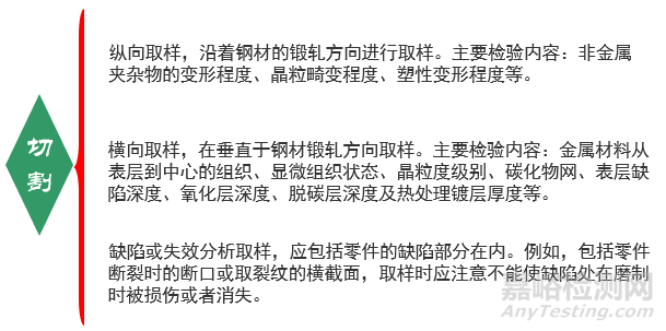 試樣可以用手鋸、砂輪切割機、電火花切割機、車、銑、鋸等方式。脆而硬的金屬可以用錘擊法取樣。不論使用何種方法切割,均應(yīng)該注意不能使試樣由于變形或受熱導(dǎo)致組織發(fā)生變化。對于使用高溫切割的試樣,必須除去熱影響部分。