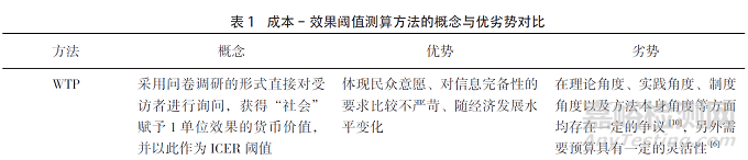 將現(xiàn)有ICER閾值測(cè)算方法的概念及優(yōu)劣勢(shì)進(jìn)行整理歸納,最終搜集到現(xiàn)有ICER閾值的測(cè)算方法有WTP、統(tǒng)計(jì)壽命價(jià)值分析法、影子價(jià)格法、先例法、機(jī)會(huì)成本法、人均GDP法、閾值尋求者模式和經(jīng)驗(yàn)確定法。由于經(jīng)驗(yàn)確定法理論依據(jù)不足,本文只對(duì)其他相對(duì)具有理論依據(jù)的閾值測(cè)算方法進(jìn)行介紹,各閾值測(cè)算方法的概念和優(yōu)劣勢(shì)對(duì)比如表1所示。