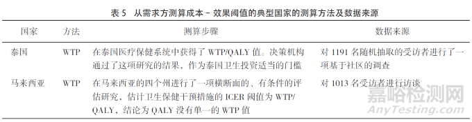 從需求方測(cè)算成本-效果閾值的國(guó)家以泰國(guó)和馬來(lái)西亞為代表,主要使用的方法為WTP,但在實(shí)踐過(guò)程中,通過(guò)對(duì)方法的驗(yàn)證發(fā)現(xiàn)了WTP有一定的局限性,泰國(guó)的M Thavorncharoensap等學(xué)者在測(cè)算過(guò)程中發(fā)現(xiàn)性別、家庭收入和假設(shè)情景對(duì)WTP值具有重要影響。馬來(lái)西亞的Y W Lim等學(xué)者在訪談過(guò)程中了解了訪談?wù)叩纳鐣?huì)經(jīng)濟(jì)背景等,發(fā)現(xiàn)教育水平、每月家庭收入估計(jì)數(shù)以及對(duì)健康狀況的描述對(duì)WTP估計(jì)數(shù)的影響較大。此外,也有研究表明經(jīng)調(diào)研的WTP值與其調(diào)研對(duì)象的健康程度有關(guān),較差的健康狀態(tài)對(duì)應(yīng)的WTP值較高。從需求方測(cè)算成本-效果閾值的典型國(guó)家的測(cè)算方法及數(shù)據(jù)來(lái)源如表5所示。