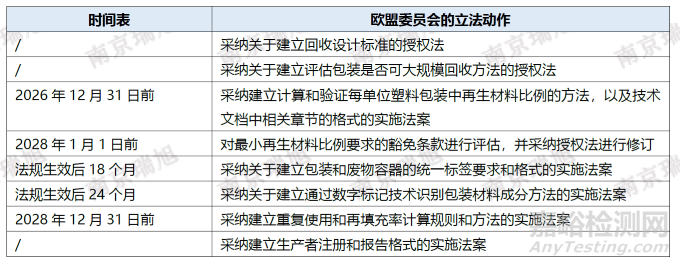 對于法規(guī)落地的一些協(xié)調(diào)標準和實施規(guī)范,目前仍未完善,但是PPWR提案中給出了計劃采取的立法動作以及相應(yīng)的時間規(guī)劃,包括但不限于下表。雖然這些計劃未來仍有可能變動,但也可為相關(guān)企業(yè)規(guī)劃產(chǎn)品包裝設(shè)計升級、材料更新?lián)Q代提供參考。