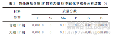 選取牌號(hào)為DC04,尺寸為0.7 mm(厚度)的IF鋼,在其他成分不變的情況下,向其中添加一定量的硼元素。將添加硼元素的IF鋼與不添加硼元素的IF鋼進(jìn)行710℃卷取+800℃退火處理,考慮到熱處理時(shí)會(huì)有硼元素殘留,因此材料中硼元素含量低于0.0002%時(shí),判定為不含硼元素,熱處理后含硼IF鋼和無硼IF鋼的化學(xué)成分分析結(jié)果如表1所示。