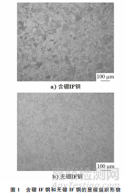 利用光學(xué)顯微鏡觀察含硼IF鋼和無硼IF鋼的顯微組織形貌,結(jié)果如圖1所示。由圖1可知:含硼IF鋼和無硼IF鋼的顯微組織均為鐵素體,其中含硼IF鋼的平均晶粒尺寸為20μm,晶粒度等級(jí)為8級(jí);無硼IF鋼的平均晶粒尺寸為22μm,晶粒度等級(jí)為8級(jí)。