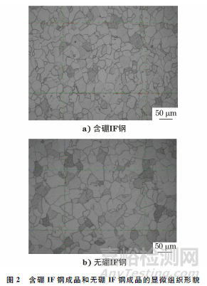 對(duì)含硼IF鋼和無硼IF鋼進(jìn)行冷軋?zhí)幚?,然后?duì)成品的顯微組織進(jìn)行分析,結(jié)果如圖2所示。由圖2可知:經(jīng)過冷軋工序后,含硼IF鋼和無硼IF鋼的晶粒尺寸均發(fā)生了較大變化,其中含硼IF鋼成品的平均晶粒尺寸為17μm,晶粒度等級(jí)為8.5級(jí);無硼IF鋼成品的平均晶粒尺寸為21μm,晶粒度等級(jí)為8級(jí)。