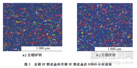 IF鋼的織構(gòu)發(fā)展需要經(jīng)歷3個(gè)階段:鑄造織構(gòu)、形變織構(gòu)和再結(jié)晶織構(gòu)。其中以再結(jié)晶織構(gòu)最為重要,因?yàn)樵俳Y(jié)晶之后會(huì)形成對(duì)IF鋼深沖性能有著極為關(guān)鍵作用的{111}織構(gòu),{111}織構(gòu)越強(qiáng)烈、均勻,其深沖性能越好,因此對(duì)于含硼IF鋼與無硼IF鋼,對(duì)比二者{111}織構(gòu)的含量,可以直觀體現(xiàn)硼元素對(duì)IF鋼深沖性能的影響。