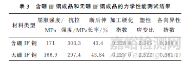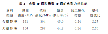(2) IF鋼的屈服強(qiáng)度、抗拉強(qiáng)度、斷后伸長率、加工硬化指數(shù)受硼元素影響不大,硼元素對(duì)塑性應(yīng)變比有較大影響,向IF鋼種添加一定量的硼元素,會(huì)使材料塑性應(yīng)變比降低。