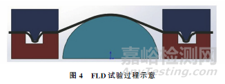 根據(jù)標(biāo)準(zhǔn)GB/T 15825.8—2008 《金屬薄板成形性能與試驗(yàn)方法 第8部分:成形極限圖(FLD)測(cè)定指南》,利用剛性凸模脹形試驗(yàn)進(jìn)行FLD試驗(yàn),試驗(yàn)過程如圖4所示,將一側(cè)板面噴有散斑的試樣置于凹模與壓邊圈之間,施加一定的壓邊力,壓牢試樣,在保證沖頭與試樣之間足夠潤滑的條件下,試樣中部在凸模力作用下均勻變形,產(chǎn)生脹形變形,并形成凸包,當(dāng)試樣局部產(chǎn)生頸縮或破裂時(shí),停止試驗(yàn),采用在線光學(xué)應(yīng)變測(cè)量系統(tǒng)對(duì)試樣的應(yīng)變進(jìn)行測(cè)量,從而獲得材料的成形極限。