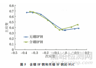 含硼IF鋼和無硼IF鋼的典型力學(xué)性能如表4所示,二者的FLC如圖5所示。由圖5可知:當(dāng)次應(yīng)變小于0時(shí),即單向拉伸變形階段,無硼IF鋼的主應(yīng)變要略高于含硼IF鋼;當(dāng)次應(yīng)變不小于0時(shí),材料處于平面應(yīng)變和等雙向拉伸應(yīng)變狀態(tài),含硼IF鋼的主應(yīng)變更高。說明對(duì)于深拉延零件,無硼IF鋼的成形性能更好;而對(duì)于一些成形較為復(fù)雜,以拉脹成形為主的零件,含硼IF鋼的成形性能更好。