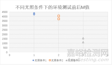 圖2 不同光照條件下的環(huán)境測試前后的M值