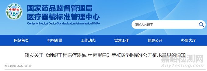 2022年8月29日,為提高絲素蛋白材料的質(zhì)量與安全性,為科學(xué)監(jiān)管提供支撐,由全國(guó)外科植入物和矯形器械標(biāo)準(zhǔn)化技術(shù)委員會(huì)組織工程醫(yī)療器械產(chǎn)品分技術(shù)委員會(huì)歸口的《組織工程醫(yī)療器械 絲素蛋白》(項(xiàng)目編號(hào):N2022100-T-zjy)已形成征求意見稿(詳見附件),并于2022年8月23日-2022年10月24日期間公開征求意見。