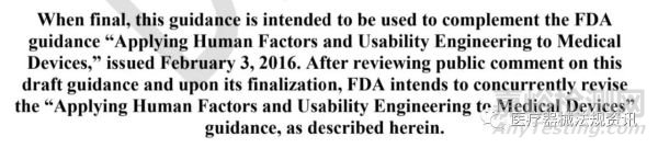 定稿后,該指南草案將用于補充FDA指南“將人為因素和可用性工程應用于醫(yī)療器械(以下簡稱為“人為因素指南”)。最終定稿后,F(xiàn)DA打算同時修訂“人為因素指南”,主要修訂包括如下四點:
