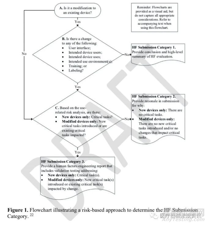 本草案中使用流程圖、表格和文本來指導提交者通過基于風險的方法推薦提交者應在其上市前遞交中包括哪些人為因素工程信息。FDA將這種基于風險的方法稱為人為因素(HF)遞交類別。提交者應使用圖1中的流程圖,并使用其配套文本來回答每個決策點提出的問題。確定哪種HF遞交類別適合支持其上市前遞交。