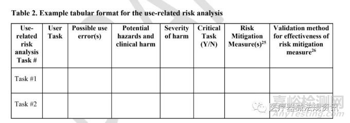應包括與使用相關的風險分析文件和/或比較任務分析,如適用。這是綜合風險分析的典型摘錄,包含通過初步分析和評估確定的所有與使用相關的危險和風險,包括與潛在使用錯誤相關的危險和風險。