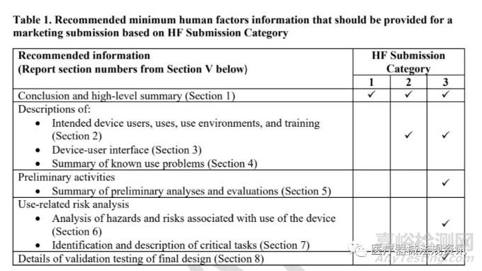 提交的文件應包括一份聲明,證明器械的修改不會影響修改器械的人為因素考慮,并利用(如果適用)先前的人為因素工程評估來提供結(jié)論和高級摘要。對于屬于HF提交類別1的器械,建議提交內(nèi)容見表1。