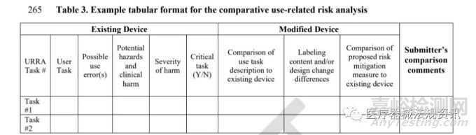 FDA認為以表格形式組織信息是有用的。表2提供了一個表格格式的例子。本示例提供了評估與您的設備相關的使用相關風險的最低建議信息。對于HF遞交類別3中的改裝器械,提交者應提供對比任務分析(見表3中的表格格式示例),將改裝器械使用相關風險分析與現(xiàn)有器械使用相關風險分析進行比較。如果確定導致任務、相關危害、和/或風險緩解措施修改的器械變更不需要新的HF驗證試驗數(shù)據(jù)來支持器械的使用安全性,請?zhí)峁├碛伞?/span>